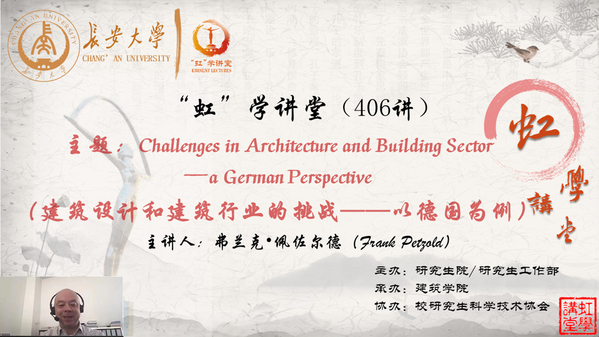 11月27日下午,由研究生院/研究生工作部主办、建筑学院承办、校研究生科学技术协会协办的“虹”学讲堂第406讲以线上讲座形式顺利举办。德国慕尼黑工业大学弗兰克•佩佐尔德教授作了题为《建筑设计和建筑行业的挑战——以德国为例》(Challenges in Architecture and Building Sector—a GermanPerspective)的报告,相关学院共360余名师生参加讲座。