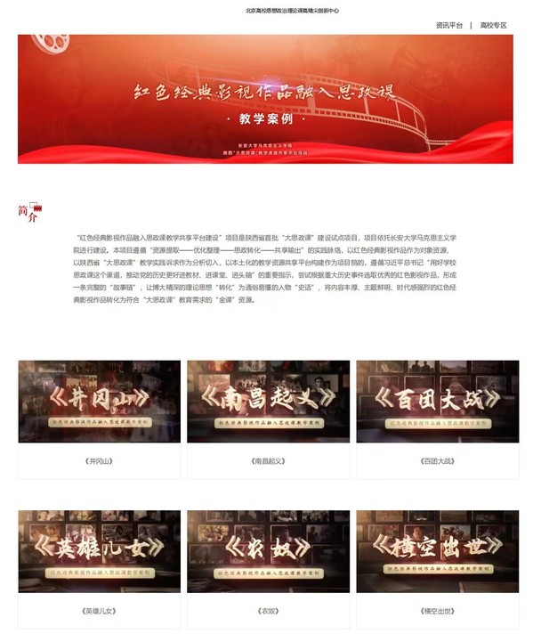 北京高校思想政治理论课高精尖创新中心是以“思想政治理论课资讯平台”“马克思主义理论研究和文献支撑平台”“思想政治理论课教学资源共享平台”等六大平台基础上打造的全国高校思想政治理论课教师网络集体备课平台。“红色经典影视作品融入思政课教学”案例库的正式上线,丰富了思想政治理论课的教学素材,在提升思政课教学的生动性和有效性方面是一次有益的尝试与探索。
